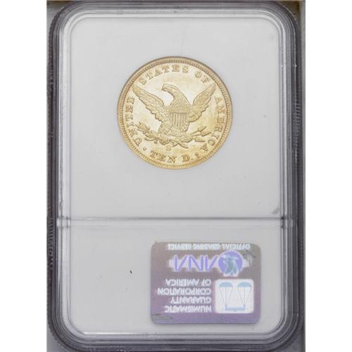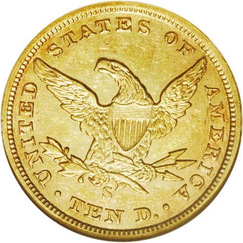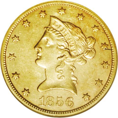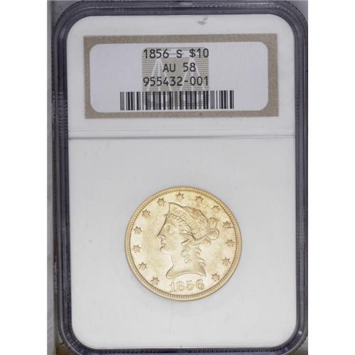 <B>1856-S<$10> AU58 NGC.</B></I> Medium S. An intricately struck and flashy piece with extensive semi-prooflike peripheral luster. Light peach toning enriches the moderately abraded surfaces. Other than the introductory 1854-S, the 1856-S is the most available San Francisco eagle prior to 1879. However, it is rare by the general standards of U.S. gold coins. Just 68,000 pieces were struck, and perhaps 300 pieces have survived the passage of time, mostly in XF to AU grades. NGC has certified just one piece as Mint State. Census: 33 in 58, 1 finer (2/06).