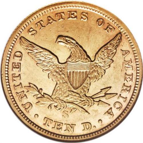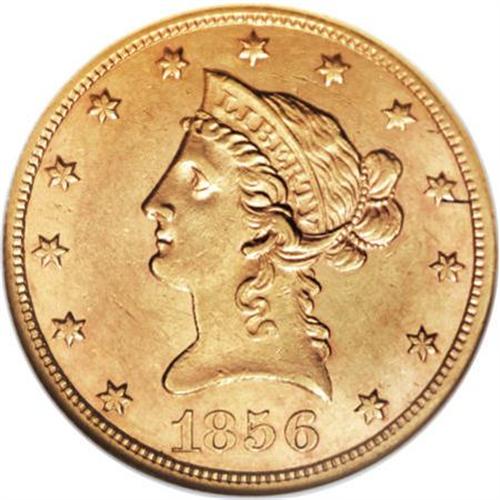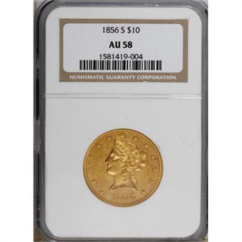 <B>1856-S $10 AU58 NGC.</B></I> Medium S. Well struck and smooth with bountiful glowing peripheral luster. Except for the '54-S, the '56-S is the least rare of the pre-1879 San Francisco issues. But since only 68,000 pieces were struck, and since there was little contemporary interest in Gold Rush coinage, examples are scarce regardless of grade. The NGC Census undoubtedly includes a number of duplicate submissions, since only three NGC AU58 pieces have appeared in prior Heritage Signature auctions. Census: 43 in 58, 1 finer (6/07).<BR><BR><b>Shipping:</b> Coins & Currency (<a target="_blank" href="http://www.heritageauctions.com/common/shipping.php">view shipping information</a>)