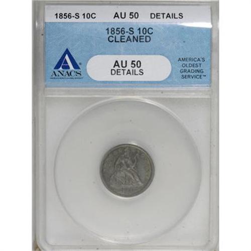 <B>1856-S 10C --Cleaned--ANACS. AU50 Details. </B></I> The first dime issue from the San Francisco Mint, and very scarce in any grade; from a low mintage of just 70,000 pieces. Well struck with a deep layer of olive-green coloration over both sides. A shallow mark is noted just to the right of the date. The coin has a subdued appearance from improper cleaning. <BR><BR><B>Coin Engraver:</B> Christian Gobrecht<BR><BR><b>Shipping:</b> Coins & Currency (<a target="_blank" href="http://www.heritageauctions.com/common/shipping.php">view shipping information</a>)