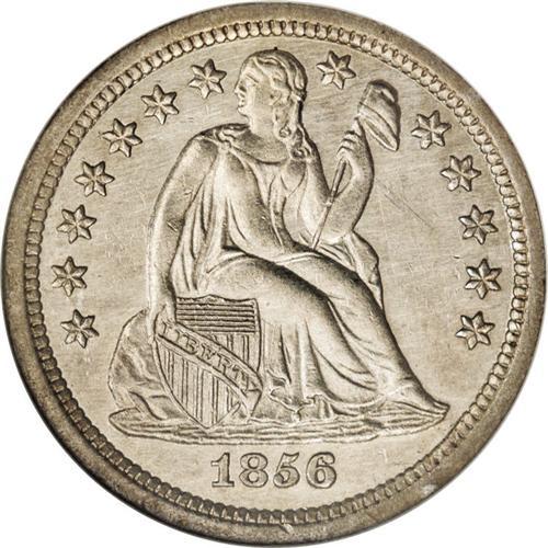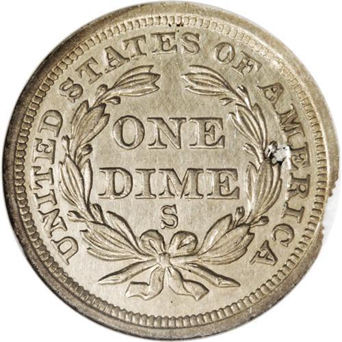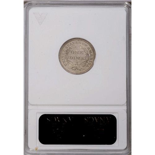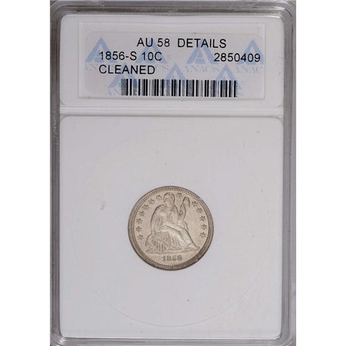 <B>1856-S<10C>--Cleaned--ANACS. AU58 Details.</B></I> Even though this example has been rather harshly cleaned with noticeable hairlines across both surfaces, it is still pleasing in overall appearance, and quite elusive with so much detail. It is also very well struck with full details on both sides.