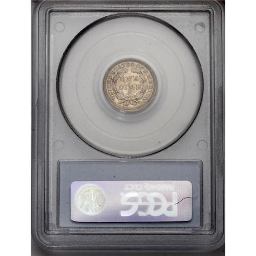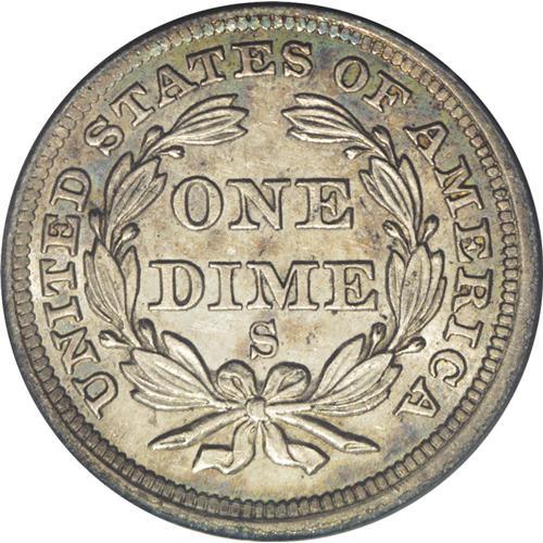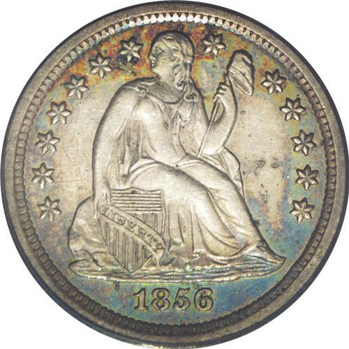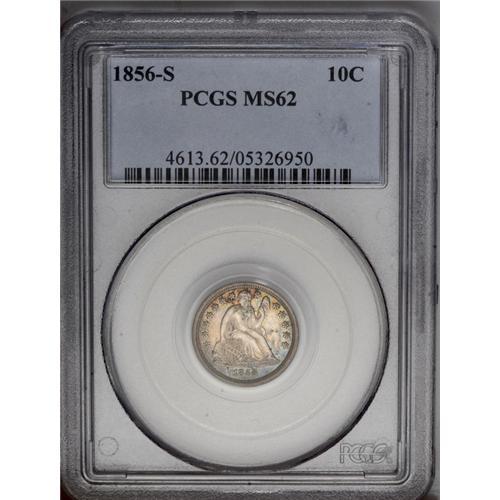 <B>1856-S<10C> MS62 PCGS.</B></I> Fortin-101. The only variety recognized for the date, and this is an early die state without any evidence of obverse or reverse die cracks. Numismatist and Seated Dime aficionado Gerry Fortin comments: "1856-S dimes are very challenging to locate in general and become rare above VF. Extremely rare in Mint State." This is a pleasing Mint State example with reflective fields. The obverse has pale ivory color with peripheral iridescence. The reverse has pale champagne color over the entire surface with hints of blue toning. Despite a few light abrasions and minor hairlines, this is a highly attractive example of the date.