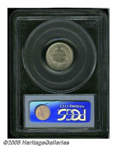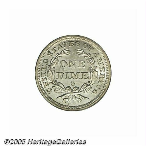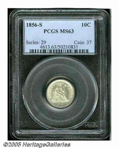 <B>1856-S<10C> MS63 PCGS.</B></I> It has been nearly eight years since we last offered a Mint State 1856-S Dime, the premier issue of the denomination from the San Francisco Mint and one whose overall scarcity is surpassed by its extreme difficulty in better grades. This untoned representative is boldly struck and exhibits a full, unimpeded cartwheel sheen throughout. Its importance to the serious collector of Seated Liberty Dimes cannot be overstated. Population: 3 in 63, 2 finer (6/05).