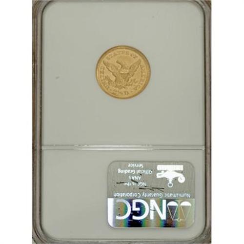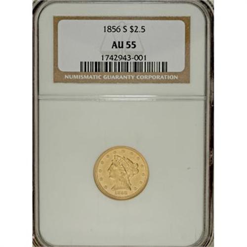 <B>1856-S $2 1/2 AU55 NGC.</B></I> The yellow-gold fields of this Choice AU coin show plain, slightly diffuse mirrors. Crisply struck with only minor wear on the central devices. An attractive and important example of this challenging early S-mint quarter eagle issue.<BR><BR><B>Coin Engraver:</B> Christian Gobrecht<BR><BR><b>Shipping:</b> Coins & Currency (<a target="_blank" href="http://www.heritageauctions.com/common/shipping.php">view shipping information</a>)