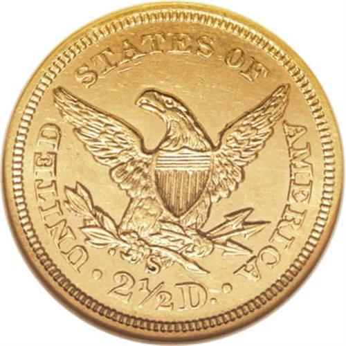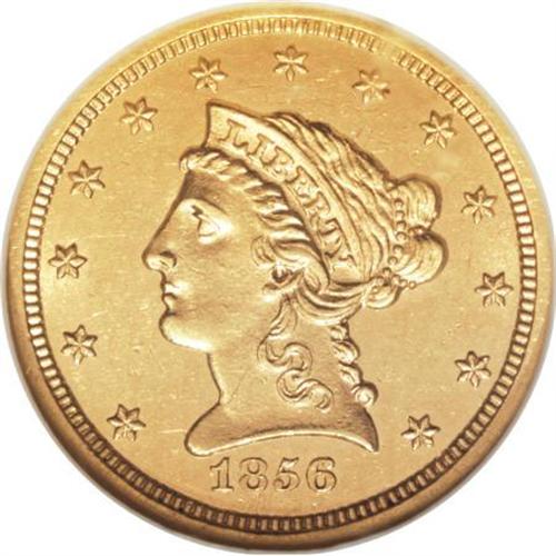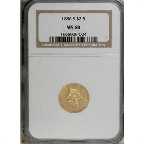 <B>1856-S $2 1/2 MS60 NGC.</B></I> The 1856-S is noteworthy as the first collectible San Francisco issue of the denomination. The 1854-S is a spectacular rarity, and the denomination was passed over in 1855, probably since mint resources concentrated on double eagle production. Most '56-S survivors grade between XF and AU. This luminous and intricately struck example has a few wispy marks, but fewer than expected of the grade. Census: 7 in 60, 17 finer (6/07).<BR><BR><b>Shipping:</b> Coins & Currency (<a target="_blank" href="http://www.heritageauctions.com/common/shipping.php">view shipping information</a>)