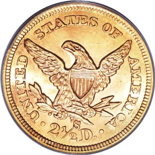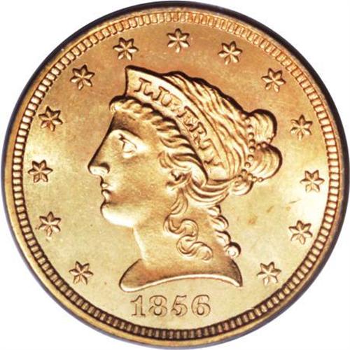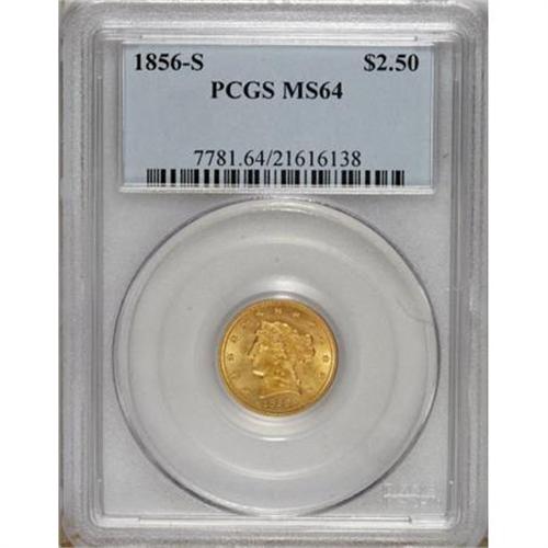 <B>1856-S $2 1/2 MS64 PCGS.</B></I> While the San Francisco Mint produced numerous double eagles in its early years of operation, the smaller gold denominations suffered comparative neglect, and production was low. The famed 1854-S quarter eagle is the most dramatic illustration of this principle, and the 1856-S quarter eagle has an original mintage of only 72,100 pieces, many of which saw heavy circulation.<BR> This carefully preserved survivor breaks the pattern. The shimmering, carefully preserved surfaces display lovely sun-gold color overall with subtle peach accents on the reverse. The largely mark-free devices have crisp detail, particularly on the needle-sharp obverse portrait, and only a handful of small marks in the fields preclude a Gem grade. A delightful representative that could find a home in the finest of sets. Population: 4 in 64, 3 finer (5/07).<BR><BR><b>Shipping:</b> Coins & Currency (<a target="_blank" href="http://www.heritageauctions.com/common/shipping.php">view shipping information</a>)