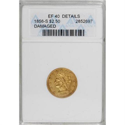 <B>1856-S $2 1/2 --Damaged--ANACS. XF40 Details.</B></I> NGC Census: (6/148). PCGS Population (7/75). Mintage: 72,100. Numismedia Wsl. Price for NGC/PCGS coin in XF40: $421. (#7781)<BR><BR><B>Coin Engraver:</B> Christian Gobrecht<BR><BR><b>Shipping:</b> Coins & Currency (<a target="_blank" href="http://www.heritageauctions.com/common/shipping.php">view shipping information</a>)