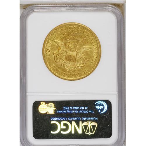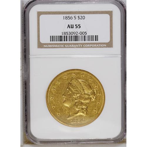 <B>1856-S $20 AU55 NGC.</B></I> A well struck orange-gold piece that has traces of luster at the periphery. Minor wear is restricted to the devices, though the handling marks are not.<BR><BR><b>Shipping:</b> Coin/Currency (<a target="_blank" href="http://www.heritageauctions.com/common/shipping.php">view shipping information</a>)