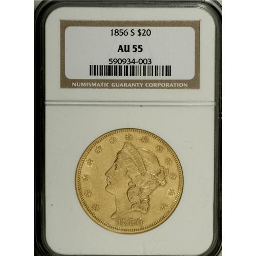 <B>1856-S $20 AU55 NGC.</B></I> Significant peripheral luster enhances the eye appeal of this early San Francisco double eagle. Lightly worn with a pair of notable abrasions on the obverse, one in front of the nose, the other running from the lip to the eye.<BR><BR><b>Shipping:</b> Coins & Currency (<a target="_blank" href="http://www.heritageauctions.com/common/shipping.php">view shipping information</a>)