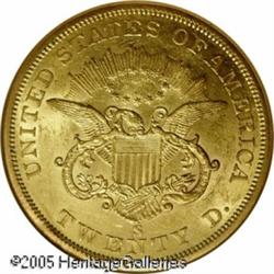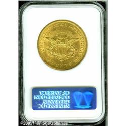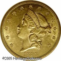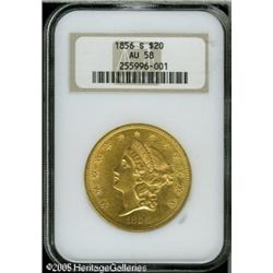 <B>1856-S $20 AU58 NGC.</B></I> This coin retains much of the original luster and the surfaces show minimal marks from brief circulation. Liberty's cheek is attractive with just a couple of minor ticks seen with a loupe, one nick is found near the base of Liberty's neck and a hidden scratch runs along the junction of Liberty's forehead and curls. On the reverse we note a small cluster of nicks below the E of STATES, and these minor handling marks will serve to identify this coin. Population: 115 in 58, 27 finer (1/05). Lot:8957