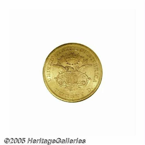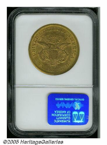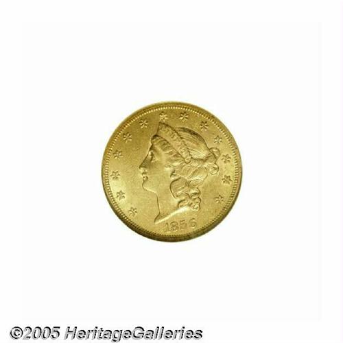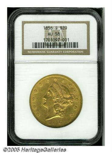 <B>1856-S<$20> AU58 NGC.</B></I> This high grade circulated type candidate displays pleasingly original khaki-gold color. Shadings of orange-copper are also evident as the coin rotates beneath the light, but the overall sharp definition is readily evident at all angles. Lightly abraded, but not excessively so for a worn S-mint gold coin from the 1850s.