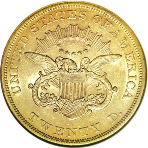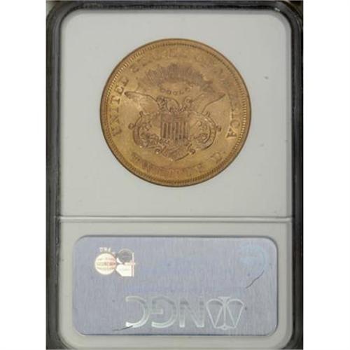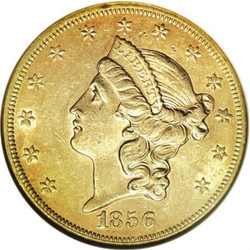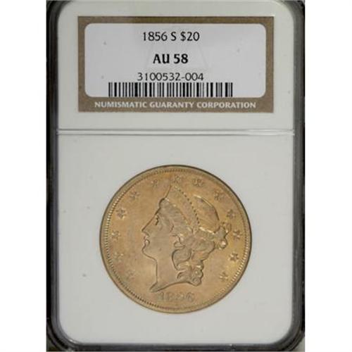 <B>1856-S $20 AU58 NGC.</B></I> Lustrous light yellow-gold surfaces serve as a background for hints of iridescent toning. This highly desirable piece is less elusive today than it was before the <I>S.S. Central America </B></I>discovery, yet it is still a desirable twenty. <BR><BR><B>Coin Engraver:</B> James B. Longacre<BR><BR><b>Shipping:</b> Coins & Currency (<a target="_blank" href="http://www.heritageauctions.com/common/shipping.php">view shipping information</a>)