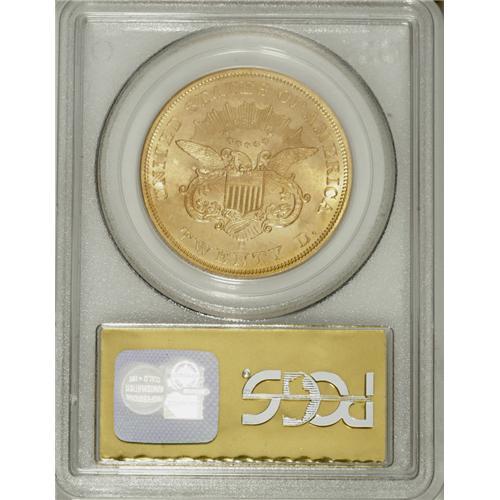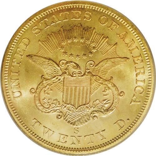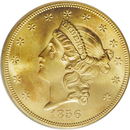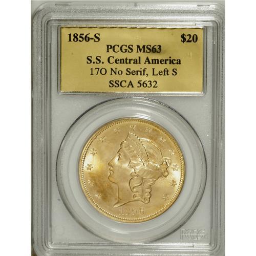 <B>1856-S $20 No Serif, Left S MS63 PCGS.</B></I> When a ship begins to slip beneath the waves, it has a tendency to focus the attention of passengers on what is important and what is not so important. That was brought out in this passage as related by Q. David Bowers:<BR><BR> "Ladies left behind unnecessary baggage. Some, 'as if to illustrate how little value was the gold, brought out bags (not entrusted to the purser) and scattered it on the floor, asking all who wanted money to help themselves.' A few ladies picked up pieces, but none took more than two $20 coins."<BR><BR> This is an amazingly well-preserved example that has superior luster for the grade and attractive, light rose and lilac coloration. Fully struck throughout. All the Blanchard packaging is included with this piece.<BR><BR><b>Shipping:</b> Coin/Currency (<a target="_blank" href="http://www.heritageauctions.com/common/shipping.php">view shipping information</a>)