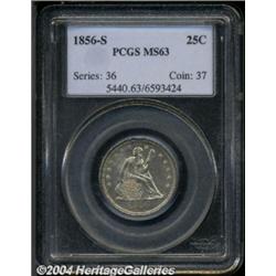 <table><tbody><tr><td><table> <TR><TD width="100%"><TABLE cellSpacing=1 cellPadding=3 width="100%" border=0><TBODY><TR><TD width="100%" bgColor=#79735c><FONT face=arial color=#ffffff size=3><B>Description</B> </FONT></TD></TR><TR><TD width="100%" bgColor=#ffffff><FONT face=arial size=2><B>1856-S 25C MS63 PCGS.</B></I> An absolute as well as condition rarity, only 286,000 pieces were produced of this date. Since circulating coinage was so scarce in California at that time, most of the coins struck entered circulation and stayed there. Most survivors are well worn and/or impaired, and Briggs (1991) notes that this issue is "very rare" in Mint State. Fully frosted beneath delicate golden-tan iridescence, the surfaces are well endowed with bold striking definition. This is not a smooth coin, but the scattered abrasions are both small in size and few in number for the assigned grade. Population: 1 in 63, 1 finer (10/03).<BR><I>From The Dr. Robert Wharton Collection.</B></I> </FONT></TD></TR></TBODY></TABLE></TD></TR></TBODY></TABLE><BR><A name=PricesRealized></A><TABLE cellSpacing=0 cellPadding=0 width="100%" bgColor=#000000 border=0><TBODY><TR><TD width="100%"><TABLE cellSpacing=1 cellPadding=3 width="100%" border=0><TBODY><TR><TD width="100%" bgColor=#79735c><A name=PR><FONT face=arial color=#ffffff size=3><B>Previous Prices from Heritage Auctions</B> </FONT></A></TD></TR><TR><TD bgColor=#f6f6ed><TABLE cellSpacing=0 cellPadding=0 width="100%" border=1><TBODY><TR><TD align=middle width="33%"><B>Date</B></TD><TD align=middle width="33%"><B>Service</B></TD><TD align=middle width="33%"><B>Price</B></TD></TR><TR bgColor=whitesmoke><TD width="33%"><B>11/15/2001</B></TD><TD width="33%">PCGS</TD><TD width="33%">$6,325.00</TD></TR></TBODY></TABLE></TD></TR><TR><TD bgColor=#ffffff><FONT face=arial size=1 ?>PLEASE NOTE: All prices realized reflect the final hammer price PLUS the buyer's premium in auctions that charge a buyer's premium. Each item has a notation at the top of the listing indicating whether that lot included a buyer's premium. Example: A item that sells with a final hammer price of $100 and a 20% buyer's premium will display with a price realized of $120. All information listed is intended to be as accurate as possible, but errors are possible. Please use this guide carefully and inform us of any inaccuracies. </FONT></TD></TR></TBODY></TABLE></TD></TR></TBODY></TABLE><BR><TABLE cellSpacing=0 cellPadding=0 width="100%" bgColor=#000000 border=0><TBODY><TR><TD width="100%"><TABLE cellSpacing=1 cellPadding=3 width="100%" border=0><TBODY><TR><TD width="100%" bgColor=#79735c colSpan=6><FONT face=arial color=#ffffff size=3><B>Price Guide*</B> </FONT></TD></TR><TR bgColor=#f6f6ed><TD align=middle><B>Grade</B> </TD><TD align=middle><B>Coin World<BR>(Trends)</B> </TD><TD align=middle><B>Numismedia<BR>Retail</B> </TD><TD align=middle><B>Numismedia<BR>Wholesale</B> </TD><TD align=middle><B>Coin<BR>Universe</B> </TD><TD align=middle><B>Heritage<BR>Value Index</B> </TD></TR><TR bgColor=#ffffff><TD align=middle>62</TD><TD align=right>$5,000.00</TD><TD align=right>---</TD><TD align=right>---</TD><TD align=right>---</TD><TD align=right>$3,586.11</TD></TR><TR style="FONT-WEIGHT: bold" bgColor=#cccfdd><TD align=middle>63</TD><TD align=right>$9,000.00</TD><TD align=right>---</TD><TD align=right>---</TD><TD align=right>$7,250.00</TD><TD align=right>$5,291.67</TD></TR><TR bgColor=#ffffff><TD align=middle>64</TD><TD align=right>---</TD><TD align=right>---</TD><TD align=right>---</TD><TD align=right>---</TD><TD align=right>$11,250.00</TD></TR><TR bgColor=#ffffff><TD colSpan=6><FONT size=1>*All information listed is intended to be as accurate as possible, but errors are possible. No item may be returned or refused based on this information which is provided as a service to our customers. You should contact each pricing source directly to determine the accuracy of this information. </FONT></TD></TR></TBODY></TABLE></TD></TR></TBODY></TABLE><BR><TABLE cellSpacing=0 cellPadding=0 width="100%" bgColor=#000000 border=0><TBODY><TR><TD width="100%"><TABLE cellSpacing=1 cellPadding=3 width="100%" border=0><TBODY><TR><TD width="100%" bgColor=#79735c><FONT face=arial color=#ffffff size=3><B>Population Guide</B> </FONT></TD></TR><TR bgColor=#ffffff><TD align=middle><!-- Begin Output of Population Grid--><TABLE cellSpacing=0 cellPadding=0 width="100%" border=0><TBODY><TR><TD vAlign=center><TABLE cellSpacing=0 width="100%" border=1 cellsadding="3"><TBODY><TR><TD vAlign=center><TABLE cellSpacing=0 cellPadding=3 width="100%" border=1><TBODY><TR><TD vAlign=center align=middle bgColor=#f0f1e8 colSpan=2 <CENTER><FONT face=Arial size=2><B>PCGS Pop </B></FONT><CENTER></CENTER></TD><TD vAlign=center align=middle bgColor=#f0f1e8 colSpan=2><CENTER><FONT face=Arial size=2><B>NGC Pop</B></CENTER></FONT></TD></TR><TR><TD vAlign=center><FONT face=Arial size=2>(63)</FONT> </TD><TD vAlign=center align=right><FONT face=Arial size=2>1</FONT> </TD><TD vAlign=center><FONT face=Arial size=2>(63)</FONT> </TD><TD vAlign=center align=right><FONT face=Arial size=2>0</FONT> </TD></TR><TR><TD vAlign=center><FONT face=Arial size=2>(>63)</FONT> </TD><TD vAlign=center align=right><FONT face=Arial size=2>1</FONT> </TD><TD vAlign=center><FONT face=Arial size=2>(>63)</FONT> </TD><TD vAlign=center align=right><FONT face=Arial size=2>1</FONT> </TD></TR></TBODY></TABLE></TD></TR></TBODY></TABLE></TD></TR></TBODY></TABLE><!-- End Output of Population Grid--></TD></TR></TBODY></TABLE></TD></TR></TBODY></TABLE><BR><TABLE cellSpacing=0 cellPadding=0 width="100%" bgColor=#000000 border=0><TBODY><TR> <font color='#000000'><span style='background-color: #FFFFFF'><td bgcolor='#FFFFFE'> Important notice: Heritage usually auctions material at the rate of 200-250 lots per hour. On some occasions eBay Live bid software or the Internet may not be able to keep up with the pace of the auction. We recommend placing a realistic absentee bid now as insurance to avoid disappoi