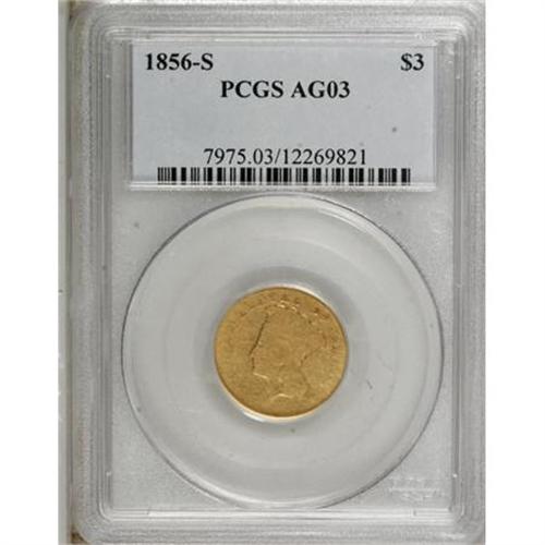 <B>1856-S $3 AG3 PCGS.</B></I> . PCGS Population (3/314). NGC Census: (0/460). Mintage: 34,500. Numismedia Wsl. Price for NGC/PCGS coin in AG3 : $858. (#7975)<BR><BR><B>Coin Engraver:</B> James B. Longacre<BR><BR><b>Shipping:</b> Coins & Currency (<a target="_blank" href="http://www.heritageauctions.com/common/shipping.php">view shipping information</a>)
