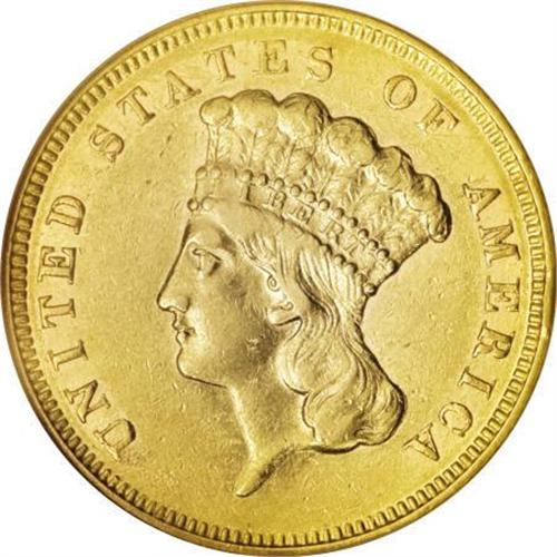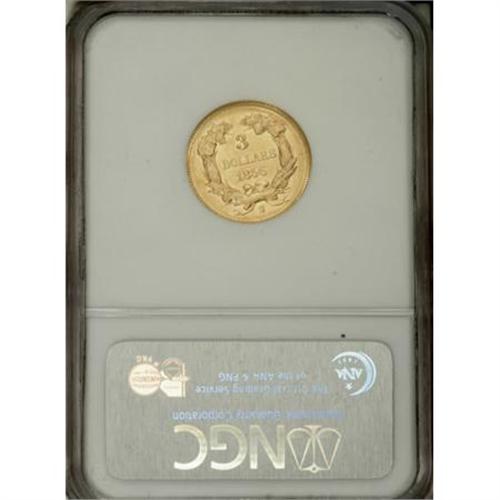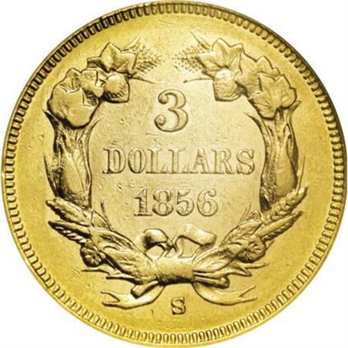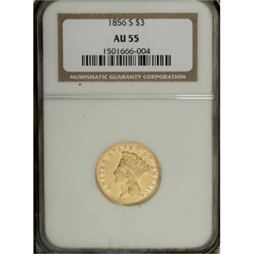 <B>1856-S $3 AU55 NGC.</B></I> Small S, the scarcer of the two mintmark sizes. Prooflike luster fills the legends and outlines the wreath. Liberty's eyebrow and hair displays only minor friction, and the obverse is refreshingly unabraded save for a small ding at 3:30. San Francisco three dollar pieces are decidedly rare in Mint State, and are scarce in any grade.<BR><BR><B>Coin Engraver:</B> James B. Longacre<BR><BR><b>Shipping:</b> Coins & Currency (<a target="_blank" href="http://www.heritageauctions.com/common/shipping.php">view shipping information</a>)