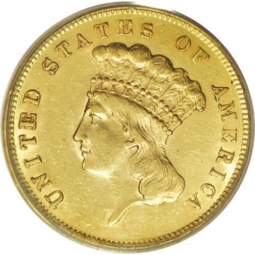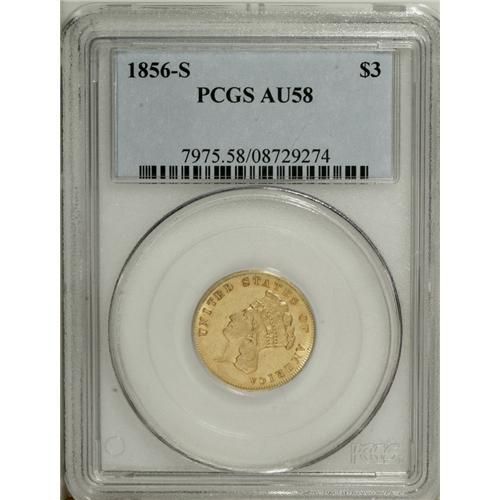 <B>1856-S $3 AU58 PCGS.</B></I> Medium S. The fields retain most of their original luster, though the highpoints betray light friction. On this well struck near-Mint piece, the surfaces display minor handling marks, though these have insubstantial impact on the eye appeal. A well-preserved survivor from an original mintage of just 34,500 coins. Population: 20 in 58, 10 finer (11/06).<BR><BR><b>Shipping:</b> Coin/Currency (<a target="_blank" href="http://www.heritageauctions.com/common/shipping.php">view shipping information</a>)