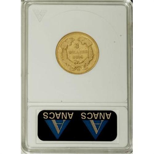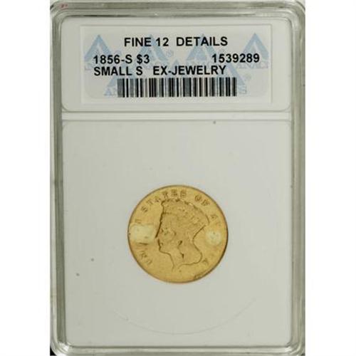 <B>1856-S $3 --Ex-Jewelry--ANACS. Fine 12 Details.</B></I> NGC Census: (1/444). PCGS Population (3/289). Mintage: 34,500. Numismedia Wsl. Price for NGC/PCGS coin in F12: $684. (#7975)<BR><BR><b>Shipping:</b> Coins & Currency (<a target="_blank" href="http://www.heritageauctions.com/common/shipping.php">view shipping information</a>)