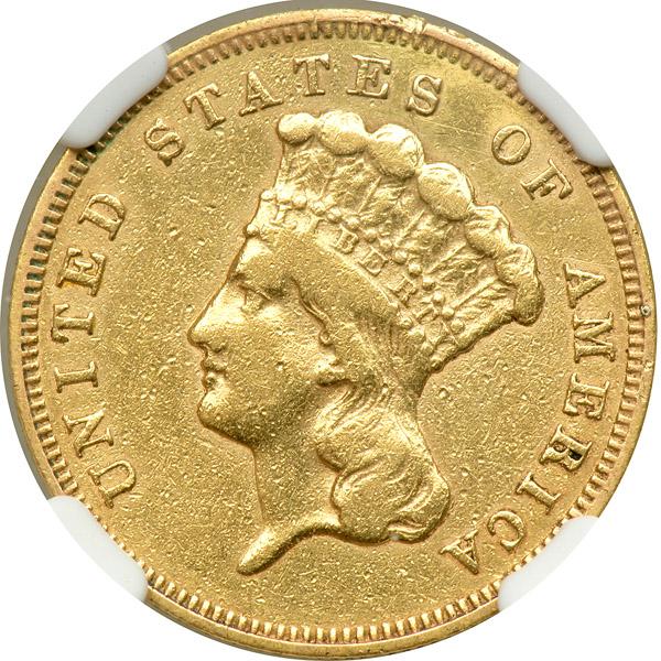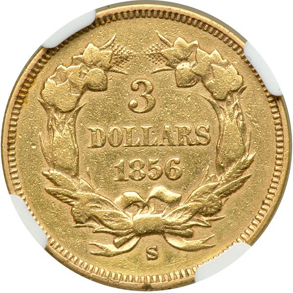 1856-S. NGC Details, removed from jewelry. Only 34,500 struck for circulation, the second year the $3 denomination was struck in San Francisco (PCGS # 7975) .