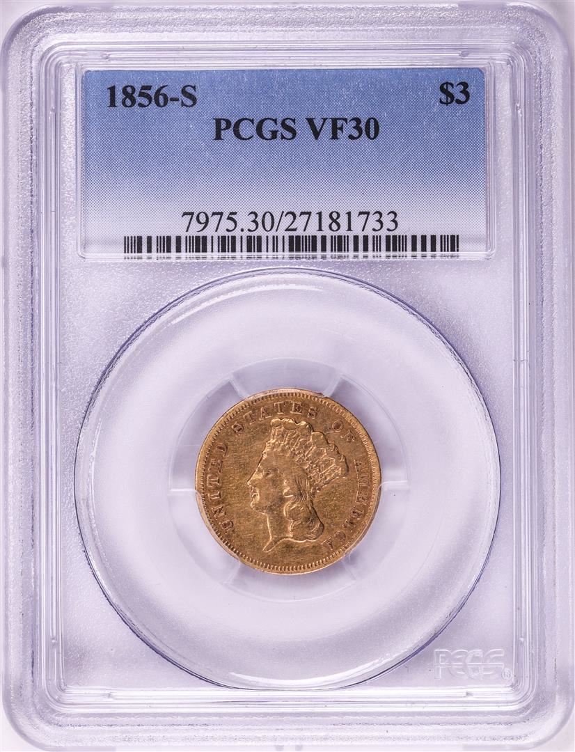 One 1856-S $3 Indian Princess Head Gold Coin PCGS VF30. PCGS Graded.