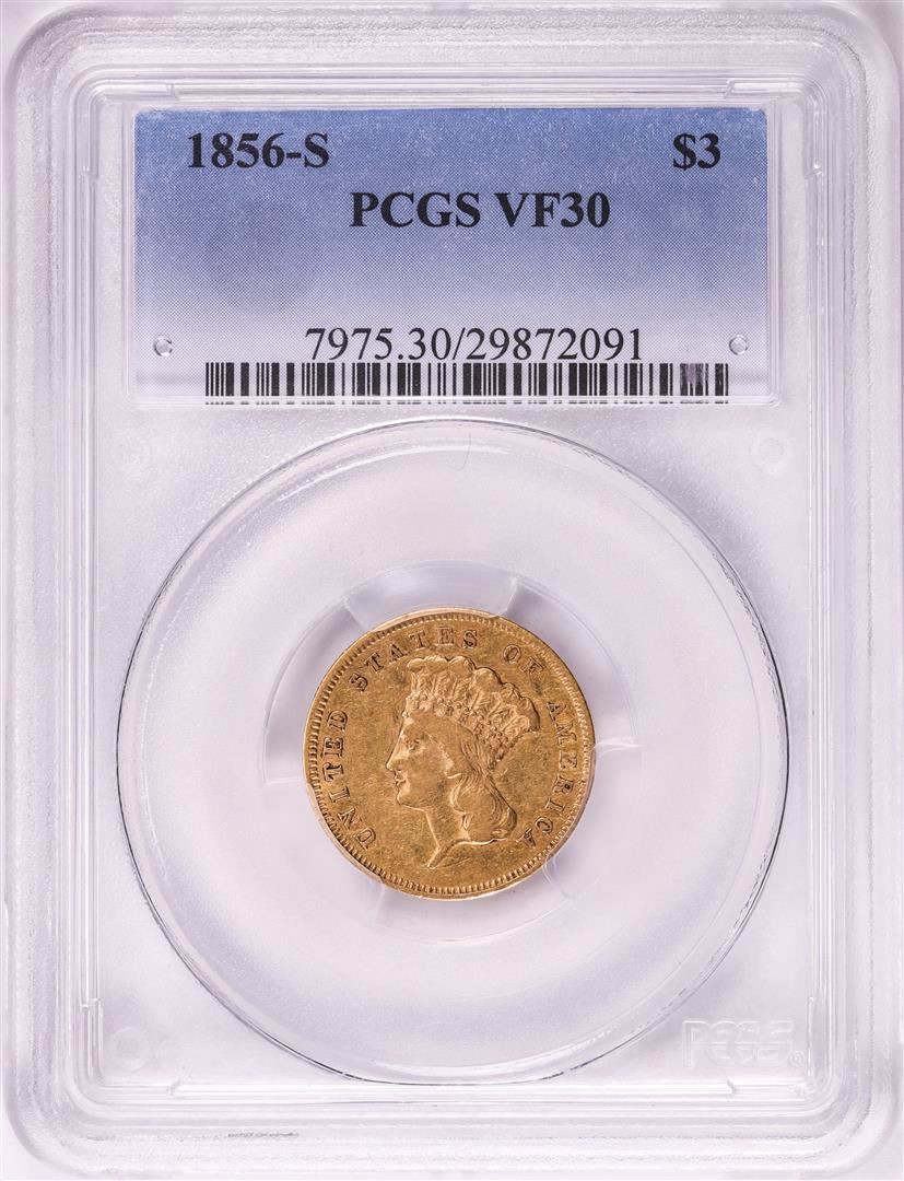 One 1856-S $3 Indian Princess Head Gold Coin PCGS VF30. PCGS Graded.