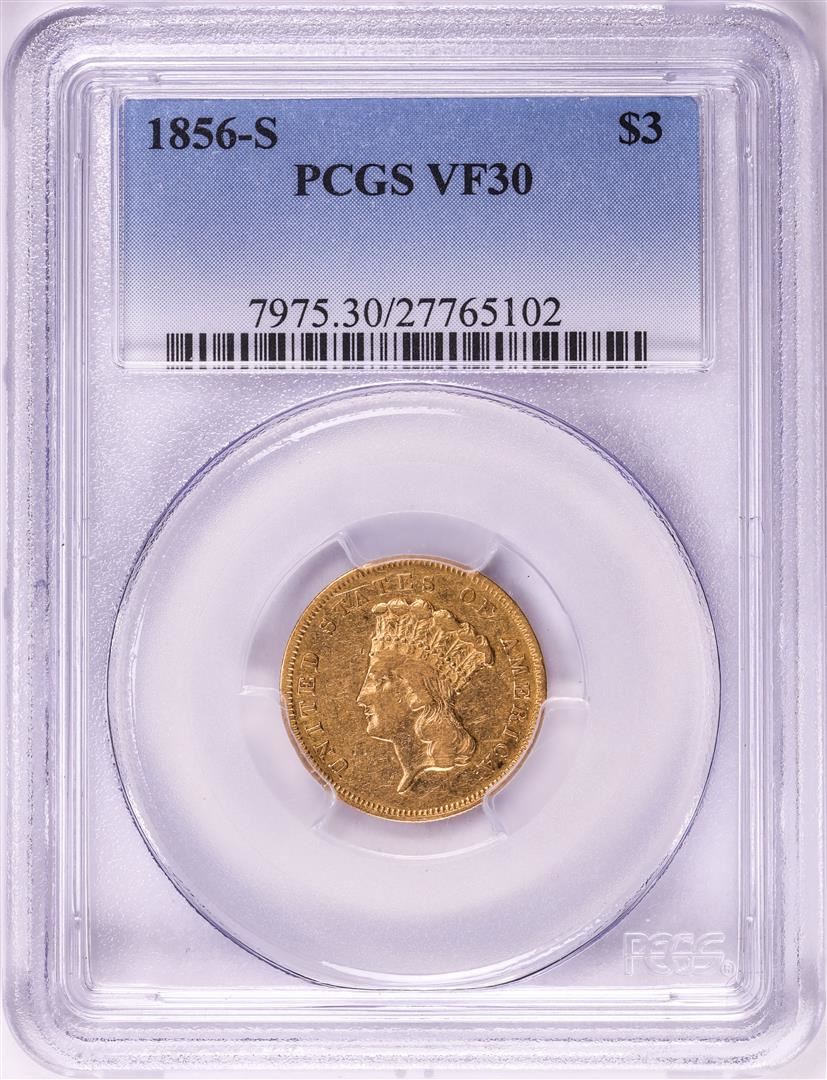 One 1856-S $3 Indian Princess Head Gold Coin PCGS VF30. PCGS Graded.