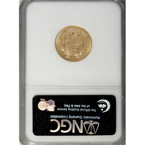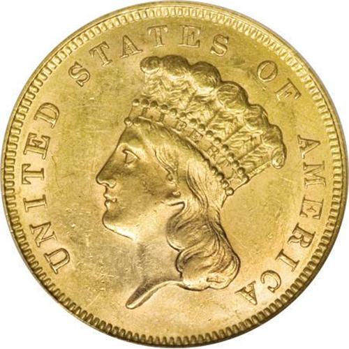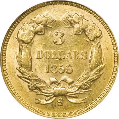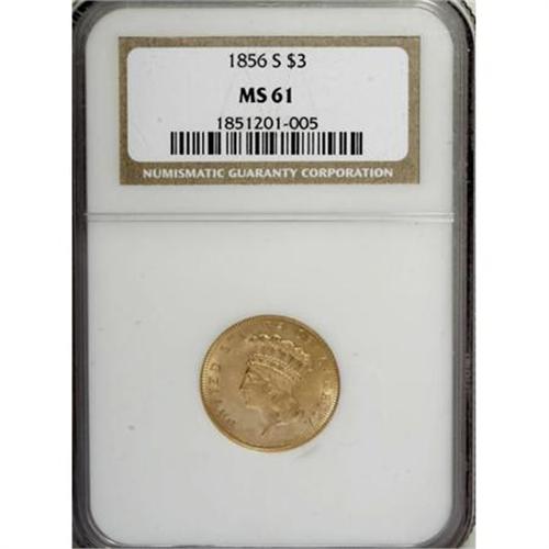<B>1856-S $3 MS61 NGC.</B></I> The typically encountered '56-S three dollar coin is apt to grade VF or XF, reflecting the fact that these coins circulated extensively in the channels of commerce. David Bowers, in his <I>United States $3 Gold Pieces</B></I> book, estimates that only 10 to 15 Mint State examples are extant. NGC and PCGS have graded nearly 30 Uncirculated specimens, some of which are likely to be resubmissions. <BR> The yellow-gold surfaces of this MS61 example display a nearly unbroken luster flow. A sharp strike manifests itself in strong definition on the design elements, save for the usual softness in some of the curls of Liberty's hair. Some light handling marks are scattered over each side. Census: 8 in 61, 11 finer (12/07).<BR><BR><B>Coin Engraver:</B> James B. Longacre<BR><BR><b>Shipping:</b> Coins & Currency (<a target="_blank" href="http://www.heritageauctions.com/common/shipping.php">view shipping information</a>)