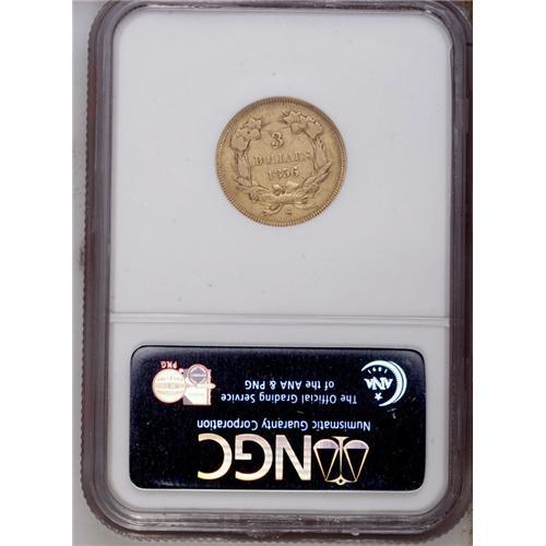 <B>1856-S<$3> VF30 NGC.</B></I> Breen-6356. Small S mintmark. A midgrade example of this popular early three dollar issue. LIBERTY is bold save for the bottom of LI. A couple of moderate marks near the date do not challenge the grade.