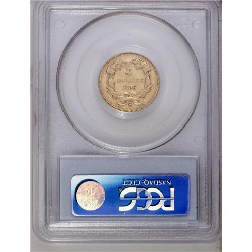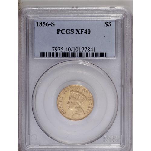 <B>1856-S<$3> XF40 PCGS.</B></I> Medium S. Moderate wear on Liberty's hair determines the grade, but substantial luster brightens the legends. An infrequent dirt speck is noted, but heavy abrasions are absent. A popular branch mint issue.