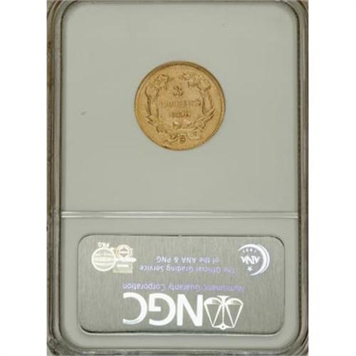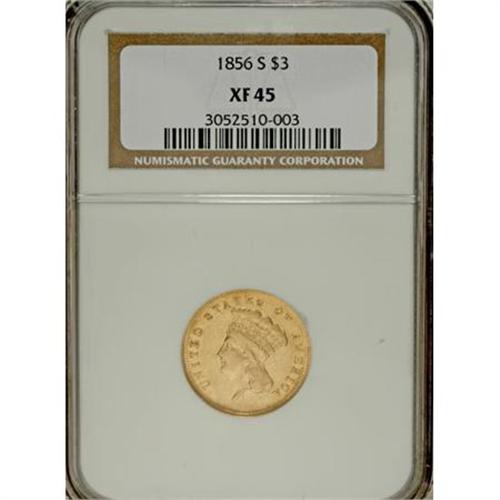<B>1856-S $3 XF45 NGC.</B></I> Medium S. This San Francisco representative displays luster within LIBERTY and selected other design recesses. Each side has one or two subdued marks, none of which are offensive.<BR><BR><B>Coin Engraver:</B> James B. Longacre<BR><BR><b>Shipping:</b> Coins & Currency (<a target="_blank" href="http://www.heritageauctions.com/common/shipping.php">view shipping information</a>)