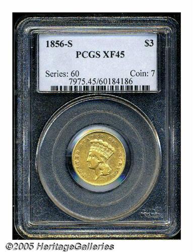 <B>1856-S<$3> XF45 PCGS.</B></I> Small S. Breen-6356. Attractive coppery-gold color with good eye appeal. Though wear is clearly evident on the high points, this example is free of singularly notable flaws.
