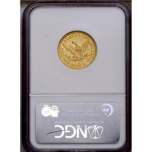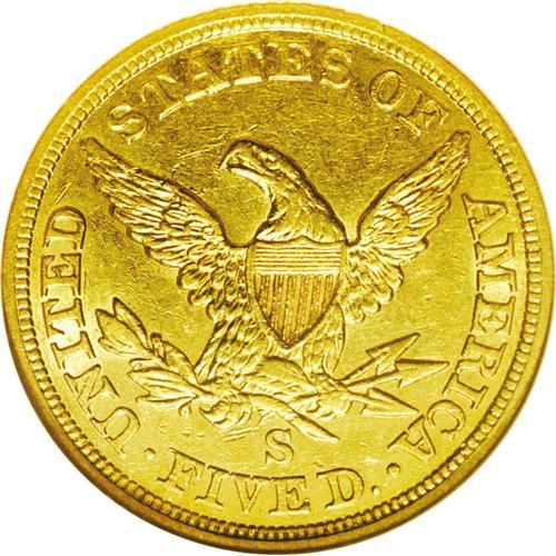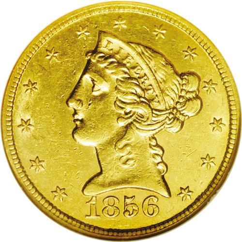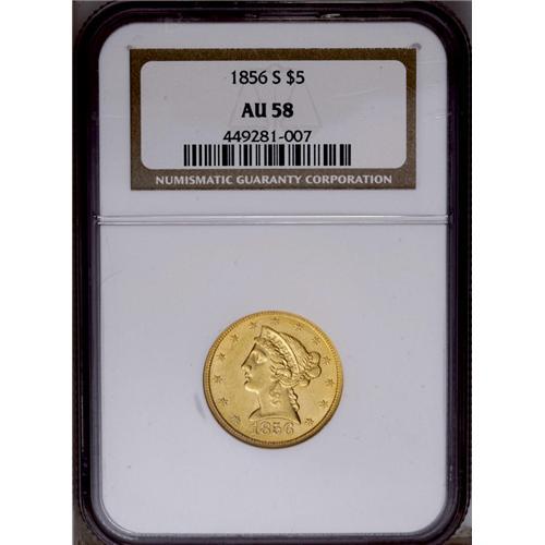 <B>1856-S<$5> AU58 NGC.</B></I> A pleasing example with slight wear and a few small abrasions. While only the third year of production in San Francisco, the mintage of 105,100 pieces was the most for the half eagle series at this mint until 1878. Most of this issue, however, went straight into the channels of commerce, and high grade examples are now scarce. Census: 16 in 58, 9 finer (4/06).