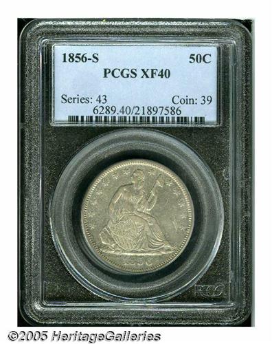 <B>1856-S<50C> XF40 PCGS.</B></I> Dappled pearl-gray and lilac toning enriches this boldly defined lower mintage example. Traces of luster glimmer from the devices and borders. A few minor ticks are of no importance. Population: 2 in 40, 22 finer (5/05).