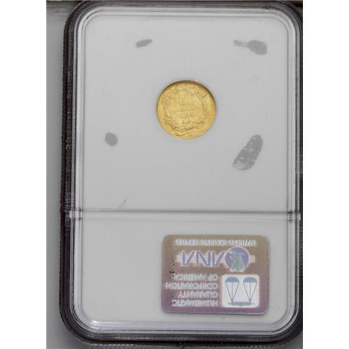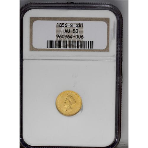 <B>1856-S G$1 Type Two AU50 NGC.</B></I> Double S. Breen-6045. Only 24,600 pieces were struck for this important issue, the final Type Two date and the sole emission of the design from the San Francisco Mint. Our auction records suggest that the Normal S and Double S are about evenly divided in rarity. A nicely defined lemon-gold example with a few thin, faint obverse abrasions.<BR><I>From The Jones Beach Collection.</B></I><BR><BR><b>Shipping:</b> Coin/Currency (<a target="_blank" href="http://www.heritageauctions.com/common/shipping.php">view shipping information</a>)