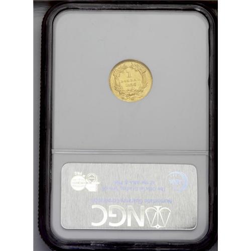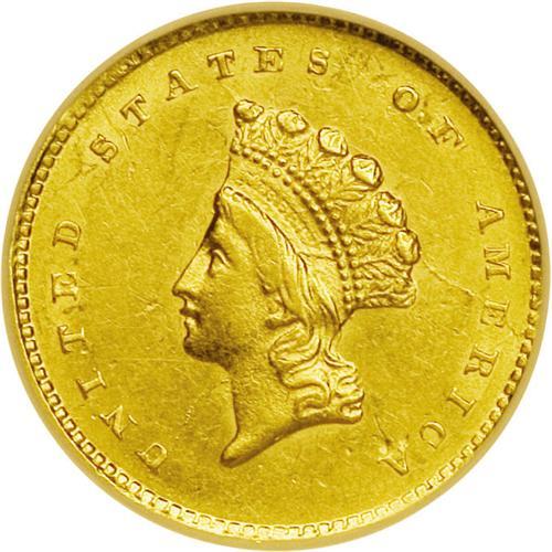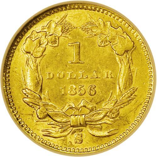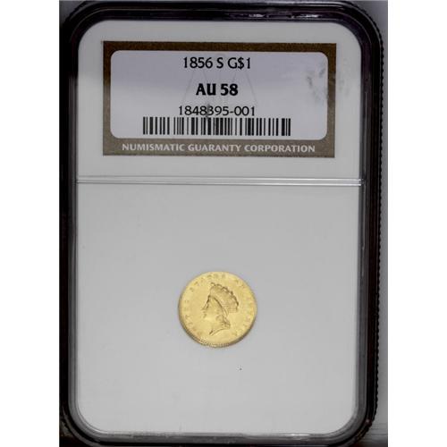 <B>1856-S<G$1> Type Two AU58 NGC.</B></I> Double S. Breen-6045. This 1856-S is significant for at least four different reasons. It is the sole Type Two issue from the San Francisco Mint. It is the final Type Two issue from any mint. It has a low mintage of 24,600 pieces. The mintmark is widely and sharply repunched. In addition, it displays vibrant peripheral luster. Inspection beneath a loupe reveals a few thin, wispy marks, but these do not challenge the eye appeal.<BR><I>From The Clifton Rodenburg Collection.</B></I>