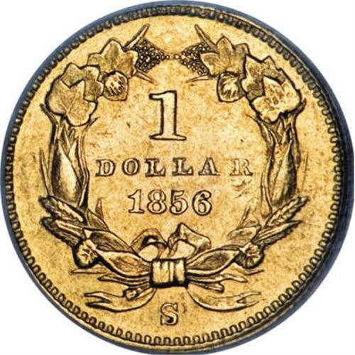 <B>1856-S G$1 Type Two AU58 NGC.</B></I> Double S. Breen-6045. The 1856-S, from a mintage of 24,600 pieces, is the final Type Two issue. This AU58 piece displays a widely repunched mintmark. Apricot-gold surfaces retain a good amount of luster, and are well impressed by the dies. A few small obverse contact marks do not significantly detract. Census: 81 in 58, 41 finer (1/08).<BR><BR><B>Coin Engraver:</B> James B. Longacre<BR><BR><b>Shipping:</b> Coins & Currency (<a target="_blank" href="http://www.heritageauctions.com/common/shipping.php">view shipping information</a>)