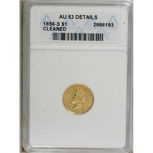 <B>1856-S G$1 Type Two--Cleaned--ANACS. AU53 Details.</B></I> NGC Census: (18/154). PCGS Population (10/80). Mintage: 24,600. Numismedia Wsl. Price for NGC/PCGS coin in AU53: $2,875. (#7536)<BR><BR><b>Shipping:</b> Coins & Currency (<a target="_blank" href="http://www.heritageauctions.com/common/shipping.php">view shipping information</a>)