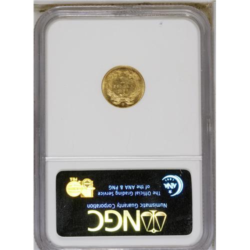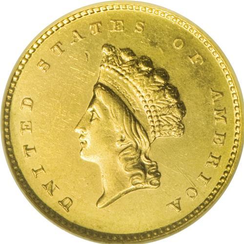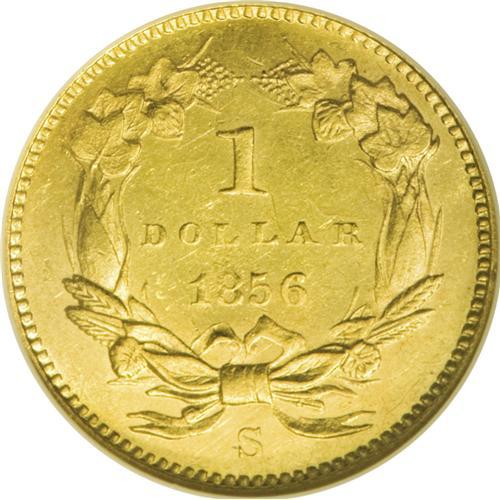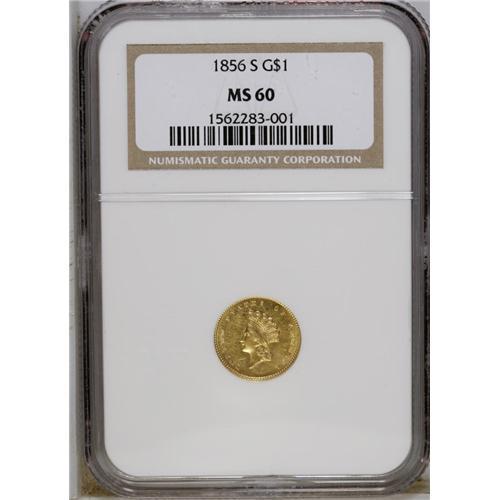 <B>1856-S G$1 Type Two MS60 NGC.</B></I> While the Philadelphia Mint Type Two gold dollars are expensive in Mint State grades, they are not particularly rare. However, the 1856-S Type Two gold dollar is a rarity in Mint State grades. It is the only S-mint issue of this short-lived design, with a mintage of just 24,600 coins. At least two reverse dies were used, as one variety has a sharply doubled mintmark. It appears that the Normal Mintmark variety (as offered here) is actually somewhat scarcer. This piece has delightful yellow-gold luster with slightly reflective surfaces. The obverse die has several die cracks, and the reverse die has faint clash marks.<BR><BR><b>Shipping:</b> Coins & Currency (<a target="_blank" href="http://www.heritageauctions.com/common/shipping.php">view shipping information</a>)