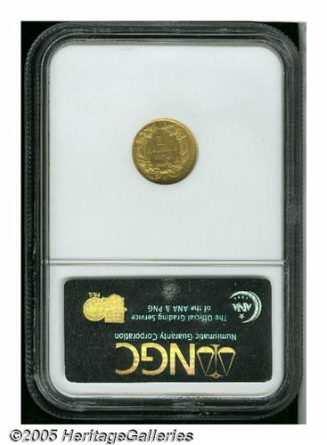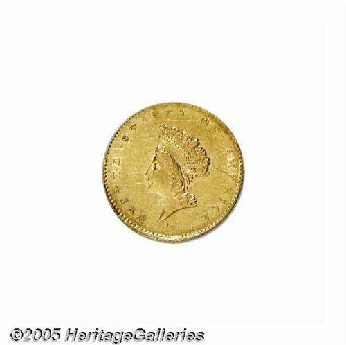 <B>1856-S<G$1> Type Two MS61 NGC.</B></I> Breen 6045, the rare Double S variety, discovered by Walter Breen in 1959. A bright, yellow-gold example, struck from old dies, with several die breaks and some faint die clash marks on the reverse. Wispy hairlines are evident on both sides. Population: 17 in 61, 15 finer (6/05).