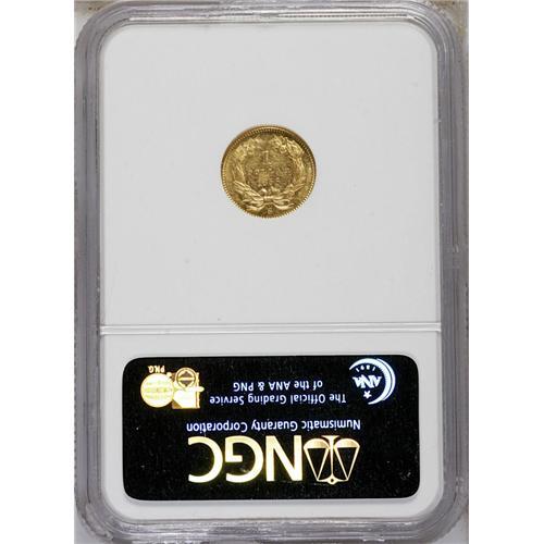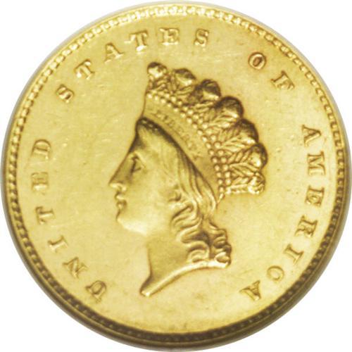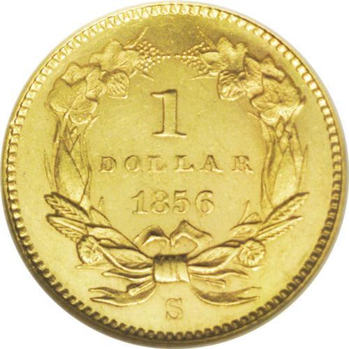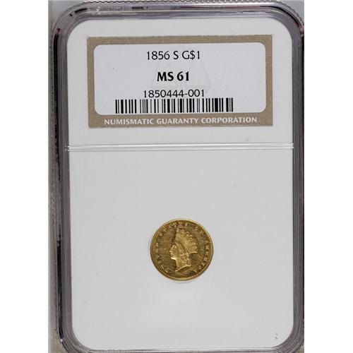 <B>1856-S<G$1> Type Two MS61 NGC.</B></I> The moderately prooflike fields exhibit only faint abrasions. Well struck, since any softness is limited to the top of the 8 in the date. The sole S-mint issue of the Type Two design. San Francisco was the only facility to strike the Small Head type in 1856, since its West Coast isolation prevented it from receiving dies of the new design until after the 1856-S gold dollars were struck. Census: 20 in 61, 16 finer (7/06).