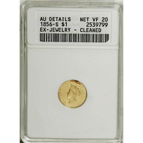 <B>1856-S G$1 Type Two--Cleaned, Ex-Jewelry--ANACS. AU Details, Net VF20.</B></I> NGC Census: (1/218). PCGS Population (0/164). Mintage: 24,600. Numismedia Wsl. Price for NGC/PCGS coin in VF20: $785. (#7536)<BR><BR><B>Coin Engraver:</B> James B. Longacre<BR><BR><b>Shipping:</b> Coins & Currency (<a target="_blank" href="http://www.heritageauctions.com/common/shipping.php">view shipping information</a>)