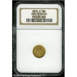 1856-S G$1 Type Two XF45 NGC. Bold and lustrous fo <B>1856-S G$1 Type Two XF45 NGC.</B></I> Bold and lustrous for the grade, this better Type Two Dollar has some faint pinscratches on the obverse that prevent an AU assessment. The only S-mint issue of the short-lived type, the geographical distance between the two coasts contributed to the use of obsolete designs instead of the Type Three motif struck in Philadelphia and Dahlonega in 1856. <BR><BR><B>Important notice:</B> Heritage usually auctions material at the rate of 200-250 lots per hour. On some occasions eBay Live bid software or the Internet may not be able to keep up with the pace of the auction. We recommend placing a realistic absentee bid now as insurance to avoid disappointment. Occasionally the auctioneer may eliminate or reject an eBay Live bid, and the auctioneer may also reopen a lot after the close of the eBay live bidding (usually because we missed an audience bid), and may reject your bid even if it shows you as the winning bidder. By bidding via eBay Live, you agree that Heritage may award the lot to another bidder at its sole discretion under the circumstances described above or any other reasonable circumstances. Since eBay bids are not shown to us until we open the lot on the floor, we treat those bids just like floor bids. In most cases the floor responds before the eBay bid is presented to us, due to Internet lag time, so for consistency we have made it a policy that floor bids are always considered first over tie eBay live bids. Also please note that all Heritage lots purchased through eBay Live carry a 20% Buyer's Premium. Please make sure you read the Terms and Conditions before you bid. This lot is being auctioned in conjunction with a live floor auction by Heritage Galleries & Auctioneers. All final auction and invoice information will be supplied by Heritage Galleries & Auctioneers, and all other information should be considered preliminary. Lot:6461