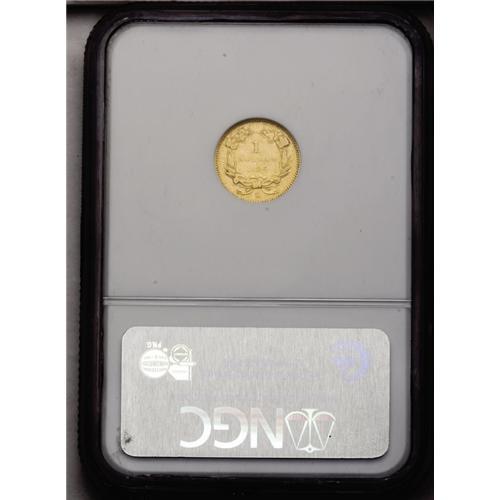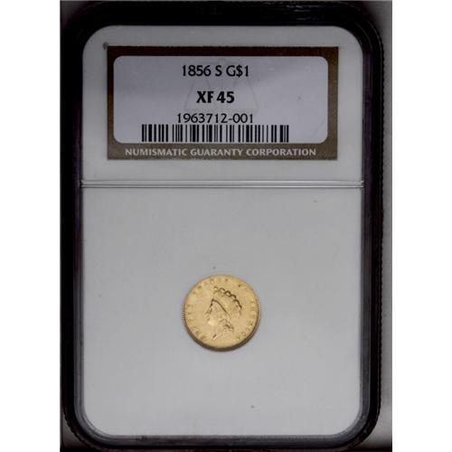<B>1856-S<G$1> Type Two XF45 NGC.</B></I> Normal S. A moderately circulated pale honey-gold example. The surfaces exhibit glimpses of luster in the recesses and lack unpleasant marks. All of LIBERTY is clear, while the upper part of the 8 in the date is weak. The final issue of the short-lived Type Two design, and the only S-mint issue of the type. Just 24,600 pieces were struck.