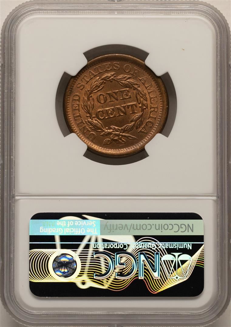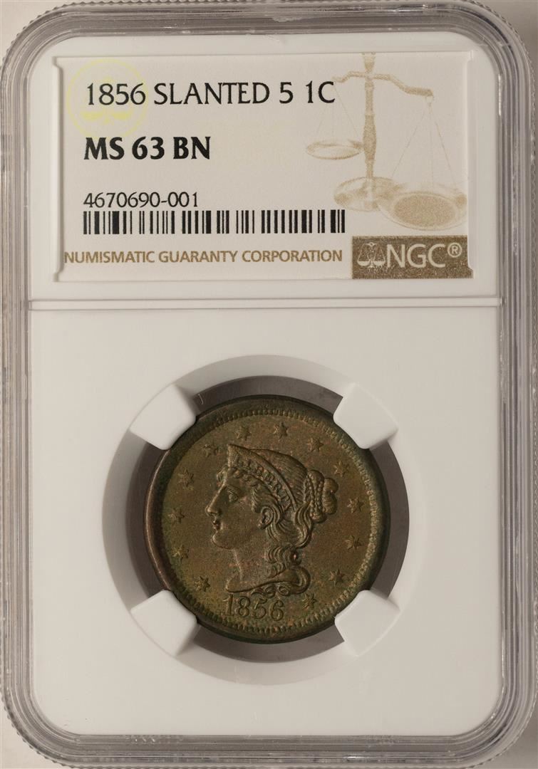 One 1856 Slanted 5 Braided Hair Large Cent Coin NGC MS63BN. NGC Certified.