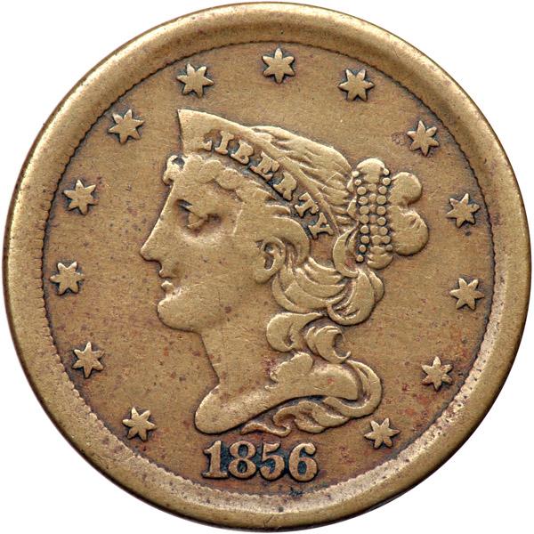 1856 in Copper Nickel Judd-177 Breen 1-B R4 Proof-12. Glossy light steel with microscopic specks of darker toning on the lower two-thirds of the obverse. Otherwise free of notable marks or other defects. Just a choice, well-circulated example that offers excellent eye appeal for the grade. Weight 68.4 grains. Davy #56.2.5.