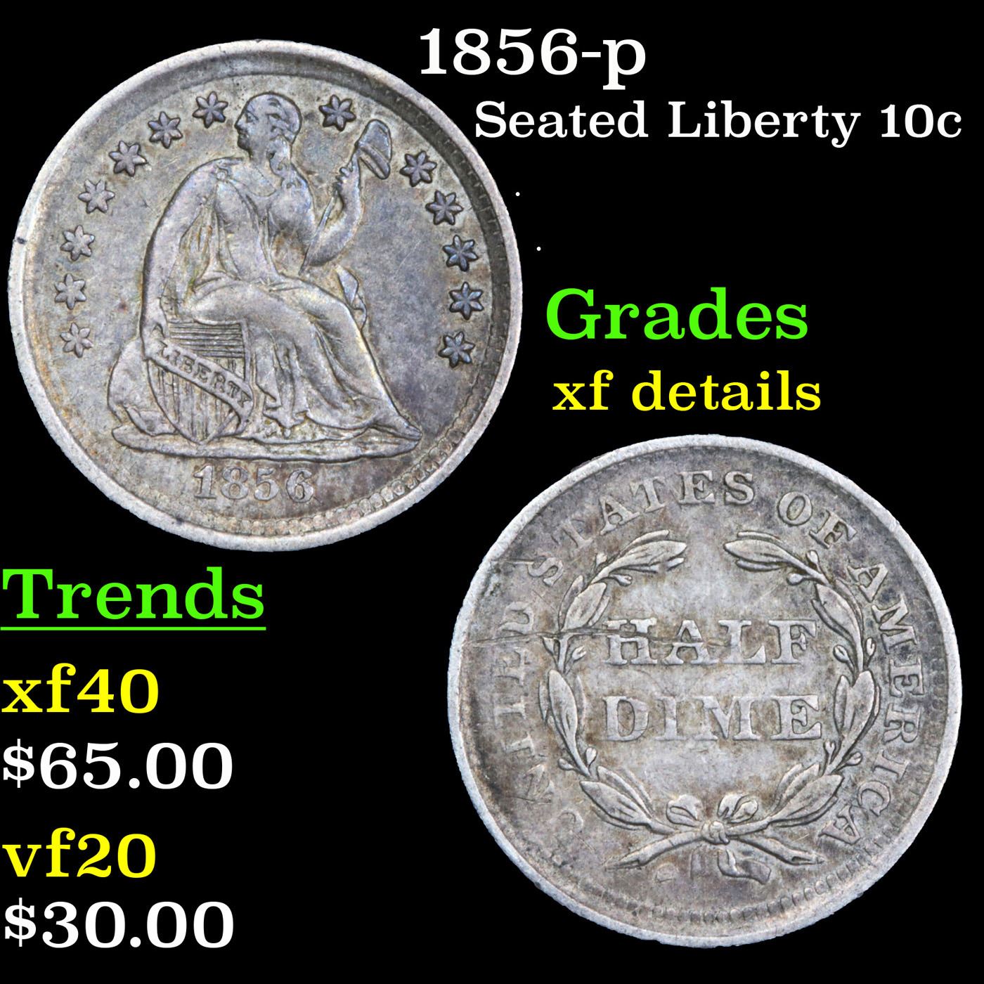 1856-p Seated Liberty Dime 10c Grades xf details.