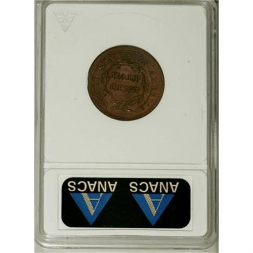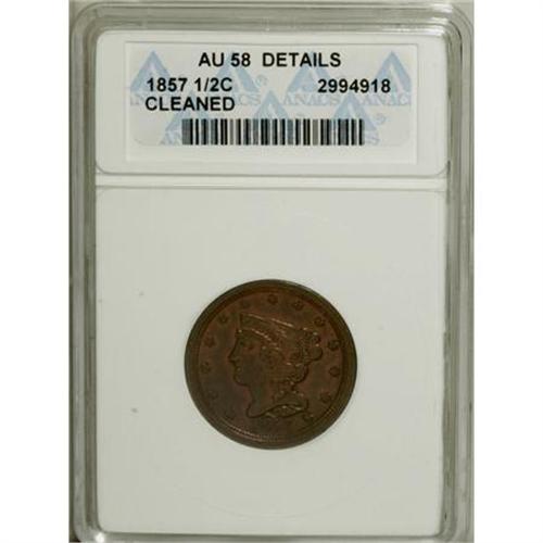 <B>1857 1/2 C --Cleaned--ANACS. AU58 Details.</B></I> NGC Census: (29/240). PCGS Population (23/136). Mintage: 35,180. Numismedia Wsl. Price for NGC/PCGS coin in AU58: $217. (#1239)<BR><BR><B>Coin Engraver:</B> Christian Gobrecht<BR><BR><b>Shipping:</b> Coins & Currency (<a target="_blank" href="http://www.heritageauctions.com/common/shipping.php">view shipping information</a>)