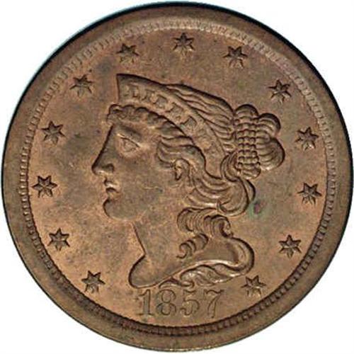 1857 1/2 C C-1, B-1, R.2 MS60. Die State 1. Medium dat 1857[1/2 C] C-1, B-1, R.2. Die State 1. MS62