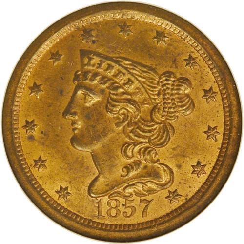1857 1/2 C MS64 Red NGC. C-1, B-1, R.2. The final date