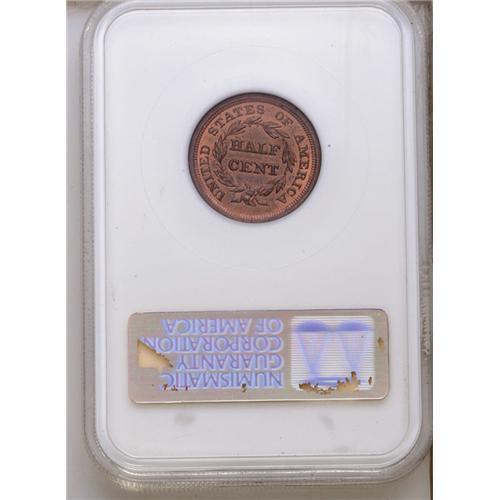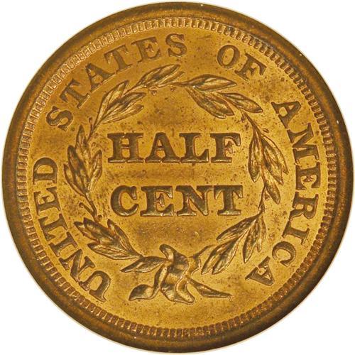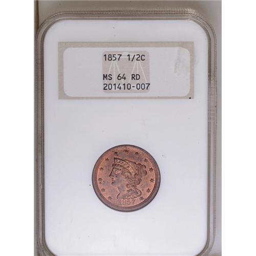 <B>1857<1/2 C> MS64 Red NGC.</B></I> C-1, B-1, R.2. The final date of the denomination, as the half cent (as well as the Large cent) was obsoleted in favor of the copper-nickel Flying Eagle small cent. 1857 is a scarcer date, and the mintage of 35,180 pieces is the smallest of any business strike Coronet half cent. This brick-red near-Gem has a reasonable strike and an especially clean reverse. The obverse and reverse fields exhibit numerous small carbon flecks. EAC 63.