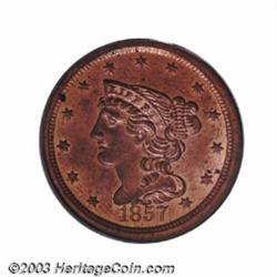 <TR><TD width="100%"><TABLE cellSpacing=1 cellPadding=3 width="100%" border=0><TBODY><TR><TD width="100%" bgColor=#79735c><FONT face=arial color=#ffffff size=3><B>Description</B> </FONT></TD></TR><TR><TD width="100%" bgColor=#ffffff><FONT face=arial size=2><B>1857 1/2 C MS64 Red PCGS.</B></I> Final year of issue for the denomination, this is an excellent type coin that displays even red luster over each side with just a touch of deeper color in the center of the obverse. Sharply defined throughout with strong definition in the centers as well as around the peripheries. Kept from a full Gem grade by the presence of a carbon spot next to the denticles at 10 o'clock on the obverse.<BR><I>From the Mark Van Deusen Collection.</B></I> </FONT></TD></TR></TBODY></TABLE></TD></TR></TBODY></TABLE><BR><A name=PricesRealized></A><TABLE cellSpacing=0 cellPadding=0 width="100%" bgColor=#000000 border=0><TBODY><TR><TD width="100%"><TABLE cellSpacing=1 cellPadding=3 width="100%" border=0><TBODY><TR><TD width="100%" bgColor=#79735c><A name=PR><FONT face=arial color=#ffffff size=3><B>Previous Prices from Heritage Auctions</B> </FONT></A></TD></TR><TR><TD bgColor=#f6f6ed><TABLE cellSpacing=0 cellPadding=0 width="100%" border=1><TBODY><TR><TD align=middle width="33%"><B>Date</B></TD><TD align=middle width="33%"><B>Service</B></TD><TD align=middle width="33%"><B>Price</B></TD></TR><TR bgColor=whitesmoke><TD width="33%"><B>09/26/1998</B></TD><TD width="33%">PCGS</TD><TD width="33%">$2,472.50</TD></TR><TR bgColor=whitesmoke><TD width="33%"><B>11/23/2002</B></TD><TD width="33%">NGC</TD><TD width="33%">$2,070.00</TD></TR></TBODY></TABLE></TD></TR><TR><TD bgColor=#ffffff><FONT face=arial size=1 ?>PLEASE NOTE: All prices realized reflect the final hammer price PLUS the buyer's premium in auctions that charge a buyer's premium. Each item has a notation at the top of the listing indicating whether that lot included a buyer's premium. Example: A item that sells with a final hammer price of $100 and a 20% buyer's premium will display with a price realized of $120. All information listed is intended to be as accurate as possible, but errors are possible. Please use this guide carefully and inform us of any inaccuracies. </FONT></TD></TR></TBODY></TABLE></TD></TR></TBODY></TABLE><BR><TABLE cellSpacing=0 cellPadding=0 width="100%" bgColor=#000000 border=0><TBODY><TR><TD width="100%"><TABLE cellSpacing=1 cellPadding=3 width="100%" border=0><TBODY><TR><TD width="100%" bgColor=#79735c colSpan=6><FONT face=arial color=#ffffff size=3><B>Price Guide*</B> </FONT></TD></TR><TR bgColor=#f6f6ed><TD align=middle><B>Grade</B> </TD><TD align=middle><B>Coin World<BR>(Trends)</B> </TD><TD align=middle><B>Numismedia<BR>Retail</B> </TD><TD align=middle><B>Numismedia<BR>Wholesale</B> </TD><TD align=middle><B>Coin<BR>Universe</B> </TD><TD align=middle><B>Heritage<BR>Value Index</B> </TD></TR><TR bgColor=#ffffff><TD align=middle>63</TD><TD align=right>---</TD><TD align=right>$660.00</TD><TD align=right>$530.00</TD><TD align=right>$685.00</TD><TD align=right>$505.25</TD></TR><TR style="FONT-WEIGHT: bold" bgColor=#cccfdd><TD align=middle>64</TD><TD align=right>---</TD><TD align=right>---</TD><TD align=right>$2,185.00</TD><TD align=right>$1,825.00</TD><TD align=right>$1,940.83</TD></TR><TR bgColor=#ffffff><TD align=middle>65</TD><TD align=right>$6,000.00</TD><TD align=right>---</TD><TD align=right>---</TD><TD align=right>---</TD><TD align=right>$3,828.00</TD></TR><TR bgColor=#ffffff><TD colSpan=6><FONT size=1>*All information listed is intended to be as accurate as possible, but errors are possible. No item may be returned or refused based on this information which is provided as a service to our customers. You should contact each pricing source directly to determine the accuracy of this information. </FONT></TD></TR></TBODY></TABLE></TD></TR></TBODY></TABLE><BR><TABLE cellSpacing=0 cellPadding=0 width="100%" bgColor=#000000 border=0><TBODY><TR><TD width="100%"><TABLE cellSpacing=1 cellPadding=3 width="100%" border=0><TBODY><TR><TD width="100%" bgColor=#79735c><FONT face=arial color=#ffffff size=3><B>Population Guide</B> </FONT></TD></TR><TR bgColor=#ffffff><TD align=middle><!-- Begin Output of Population Grid--><TABLE cellSpacing=0 cellPadding=0 width="100%" border=0><TBODY><TR><TD vAlign=center><TABLE cellSpacing=0 width="100%" border=1 cellsadding="3"><TBODY><TR><TD vAlign=center><TABLE cellSpacing=0 cellPadding=3 width="100%" border=1><TBODY><TR><TD vAlign=center align=middle bgColor=#f0f1e8 colSpan=2 <CENTER><FONT face=Arial size=2><B>PCGS Pop </B></FONT><CENTER></CENTER></TD><TD vAlign=center align=middle bgColor=#f0f1e8 colSpan=2><CENTER><FONT face=Arial size=2><B>NGC Pop</B></CENTER></FONT></TD></TR><TR><TD vAlign=center><FONT face=Arial size=2>(64)</FONT> </TD><TD vAlign=center align=right><FONT face=Arial size=2>13</FONT> </TD><TD vAlign=center><FONT face=Arial size=2>(64)</FONT> </TD><TD vAlign=center align=right><FONT face=Arial size=2>5</FONT> </TD></TR><TR><TD vAlign=center><FONT face=Arial size=2>(>64)</FONT> </TD><TD vAlign=center align=right><FONT face=Arial size=2>1</FONT> </TD><TD vAlign=center><FONT face=Arial size=2>(>64)</FONT> </TD><TD vAlign=center align=right><FONT face=Arial size=2>1</FONT> </TD></TR></TBODY></TABLE></TD></TR></TBODY></TABLE></TD></TR></TBODY></TABLE><!-- End Output of Population Grid--></TD></TR></TBODY></TABLE></TD></TR></TBODY></TABLE><BR><TABLE cellSpacing=0 cellPadding=0 width="100%" bgColor=#000000 border=0><TBODY><TR> Important notice: We expect to be auctioning lots at the rate of 200-250 per hour. On occasion eBay live bid software cannot keep up with the pace of the auctions where 4-5 lots per minute can hammer down, so we recommend that you place a realistic absentee bid now as insurance to avoid disappointment. Also please note that all Heritage/CAA lots purchased through eBay Live carry a 20% Buyer's Premium. Please make sure you read the Terms and Conditions.